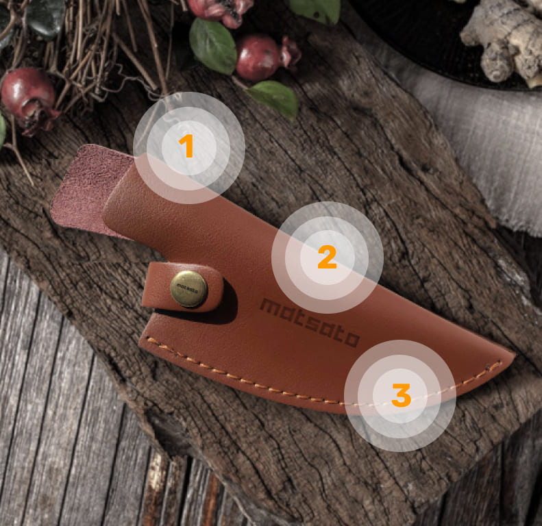 The Matsato Leather Sheath was created to perfectly mold around your Matsato knife, hugging it from the tip, right to the handle to keep your blade well protected. It provides extra padding to safeguard against accidental bumps and has a secure clasp to ensure your Matsato knife stays safely inside.